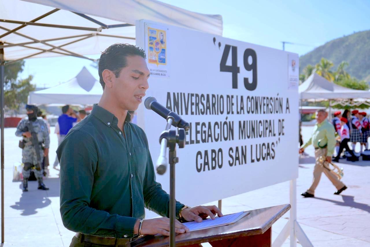 La cereminonia la encabezó la delegada de Cabo San Lucas, Karina de la O Uribe y como orador oficial participó Héctor Guerrero Santiesteban, coordinador de la Casa de la Cultura “Profa. Nieves Trasviña de Ceseña”, quien destacó la importancia histórica de este aniversario y señaló que la conversión de Cabo San Lucas a delegación municipal representó el inicio de una etapa de crecimiento, organización e identidad para la comunidad.