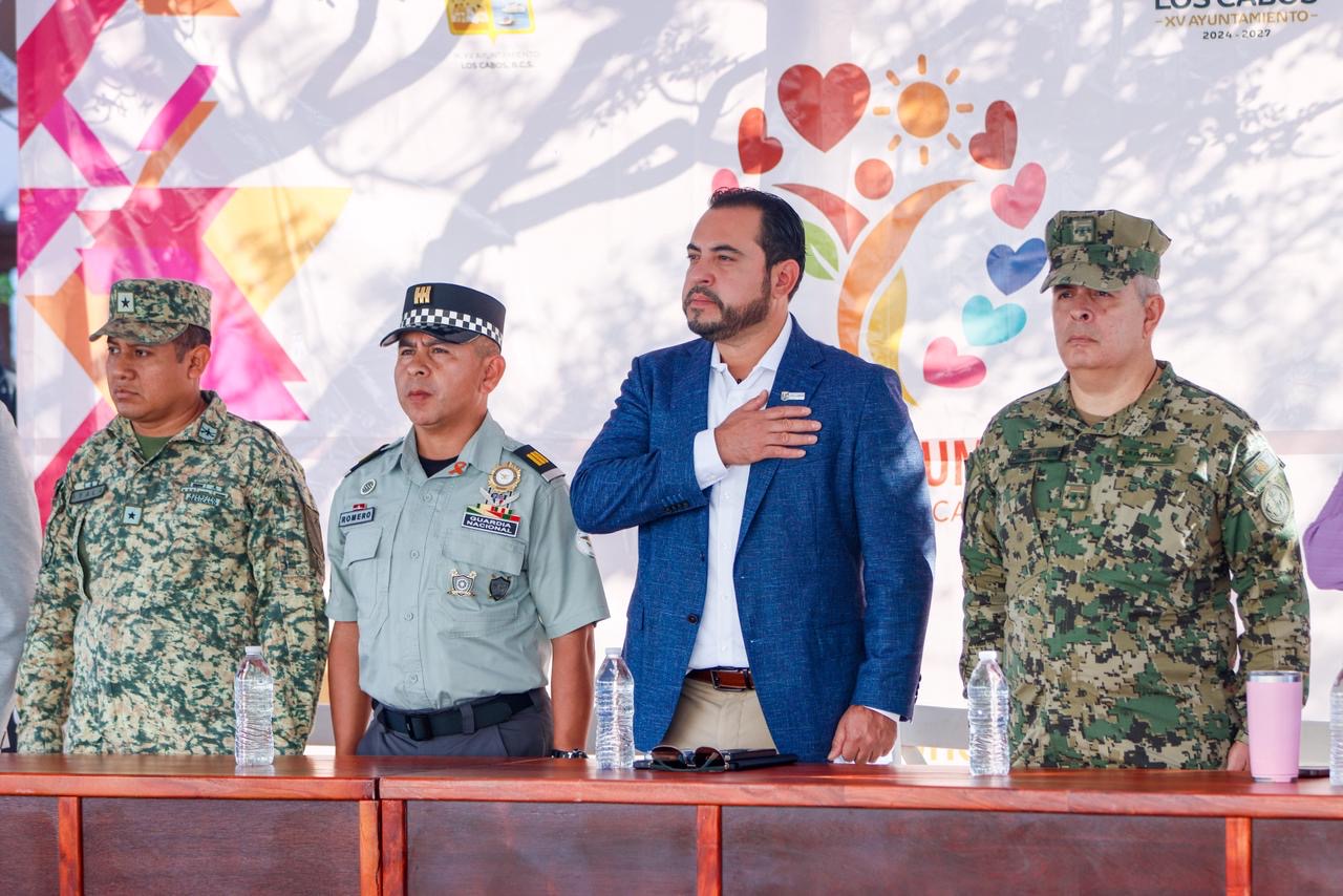 Durante la ceremonia cívica realizada en Cabo San Lucas, la Coordinación de Educación contó con el acompañamiento de la Subcoordinación de Derechos Humanos, además de la presencia de diversas autoridades municipales que reforzaron el compromiso institucional con la formación cívica y la promoción de los derechos fundamentales.