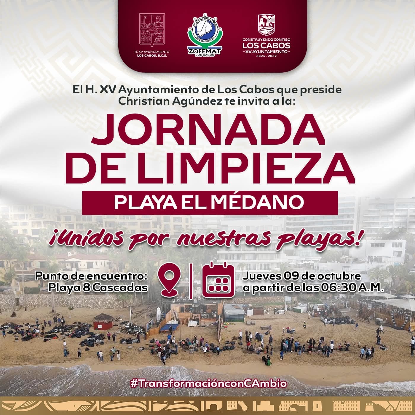 Los Cabos, Baja California Sur.- Con el objetivo de restaurar las condiciones ambientales y mantener las playas en óptimo estado tras el paso del huracán “Priscilla”, el XV Ayuntamiento de Los Cabos, a través de la Coordinación Municipal de la Zona Federal Marítimo Terrestre (Zofemat), llevará a cabo una jornada de limpieza en Playa El Médano este jueves 9 de octubre a partir de las 6:30 horas, teniendo como punto de encuentro Playa 8 Cascadas.