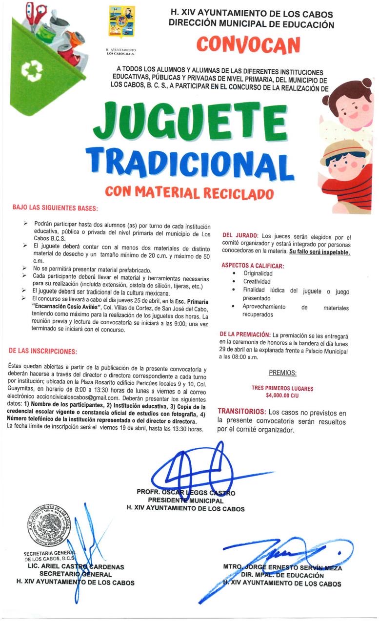 Los Cabos, B.C.S., 17 de abril del 2024.- Es momento de echar a volar la imaginación y creatividad para participar por uno de los tres premios que el Gobierno de Los Cabos a través de la Dirección Municipal de Educación estará entregando a las y los estudiantes de las diferentes instituciones públicas y privadas de nivel primaria en el Concurso Municipal del Juguete Tradicional con Material Reciclado a realizarse próximo 25 de abril.