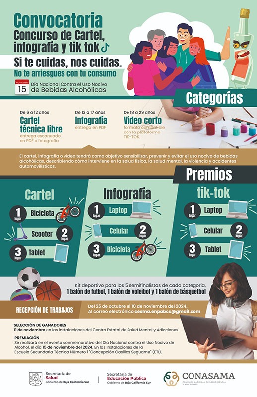A través de su Coordinación Estatal de Salud Mental y Adicciones (CESMA), la secretaría de Salud estatal lanzó la convocatoria de un concurso de cartel, infografía y video corto, dirigida a población de seis a 29 años, con el objetivo de sensibilizar a las nuevas generaciones sobre las severas afectaciones físicas y psicosociales que ocasiona el uso nocivo del alcohol.