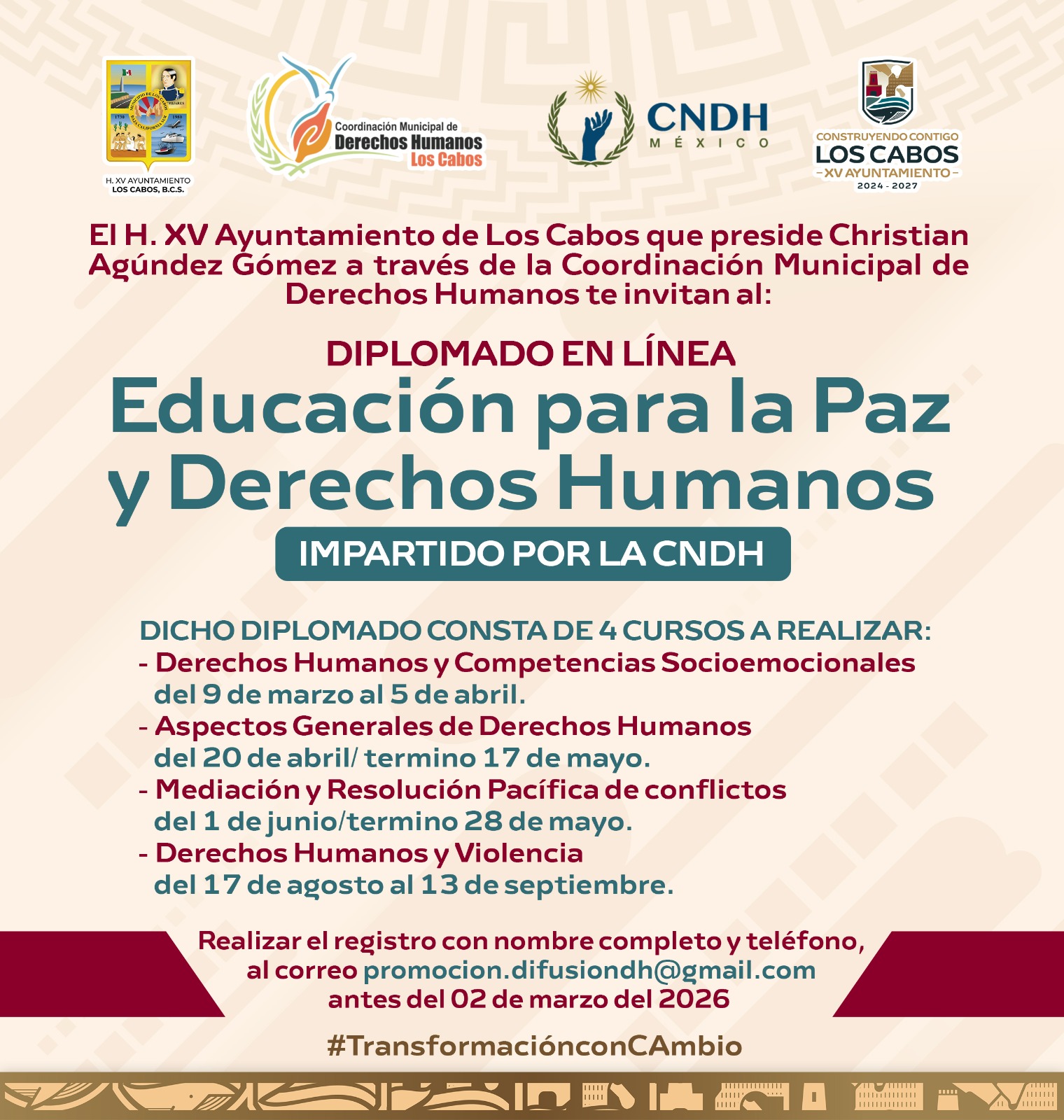 Los Cabos, Baja California Sur.– El XV Ayuntamiento de Los Cabos, a través de la Coordinación Municipal de Derechos Humanos y en vinculación con la Comisión Nacional de los Derechos Humanos (CNDH), invita a personas servidoras públicas y a la ciudadanía en general a participar en el diplomado en línea “Educación para la Paz y Derechos Humanos”.