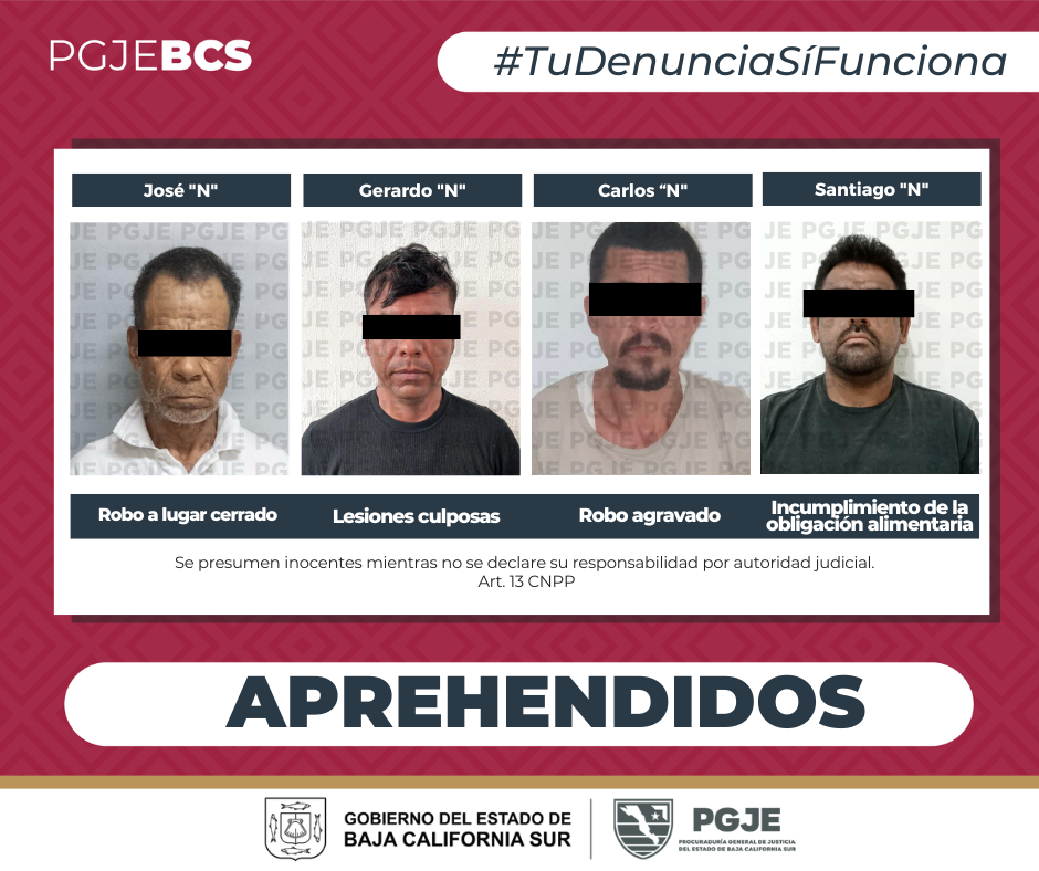 La Procuraduría General de Justicia del Estado (PGJE) de Baja California Sur cumplimentó dos órdenes de aprehensión y dos de reaprehensión en diversas localidades, como parte de las acciones para combatir la impunidad en la entidad.