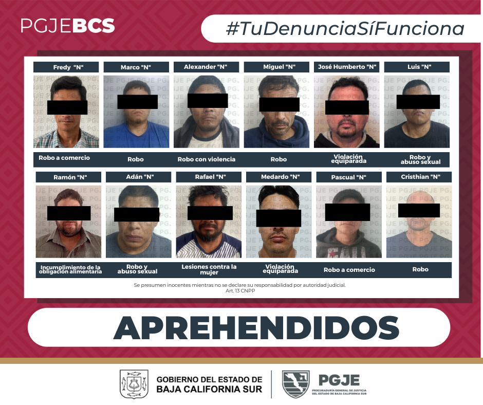 La Procuraduría General de Justicia del Estado (PGJE) de Baja California Sur, a través de agentes de investigación de la Unidad de Mandamientos Judiciales y Presentaciones, cumplimentó en días recientes diversas órdenes de aprehensión en distintos municipios de la entidad, en seguimiento a denuncias interpuestas por la ciudadanía y como parte de las acciones para combatir la impunidad y garantizar el acceso a la justicia.
