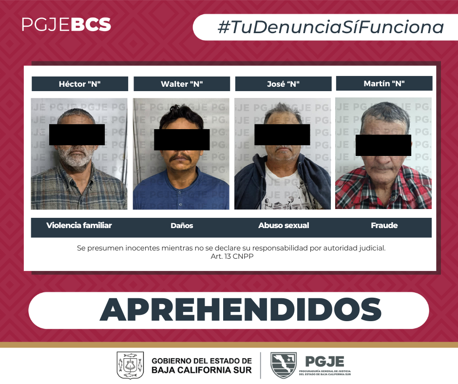Agentes de investigación de la Procuraduría General de Justicia del Estado (PGJE), Adscritos a la Unidad de Mandamientos Judiciales realizaron operativos en los municipios de La Paz Los Cabos y Mulegé, mediante los cuales cumplimentaron 4 órdenes de aprehensión a personas del sexo masculino por los delitos de violencia familiar, abuso sexual agravado, daños y fraude.