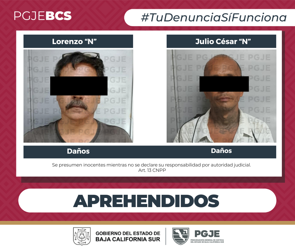 Tras las denuncias presentadas por las personasofendidas, la Procuraduría General de Justicia del Estado (PGJE) de Baja California Sur, llevó a cabo las diligencias correspondientes y labores de investigación, que permitieron obtener las órdenes de aprehensión en contra de los probable responsablesdel delito de daños, por hechos ocurridos en el municipio de La Paz.