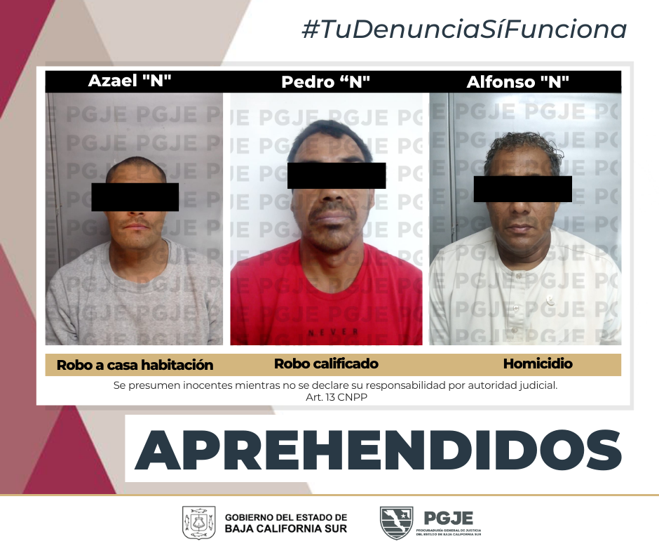 Para esclarecer los delitos y que el daño sea reparado a las víctimas la Procuraduría General de Justicia del Estado (PGJE) inició las acciones ministeriales, por lo que los imputados fueron asegurados y presentados ante la autoridad judicial, esta semana tres personas del sexo masculino, fueron aprehendidas en La Paz y en Mulegé.