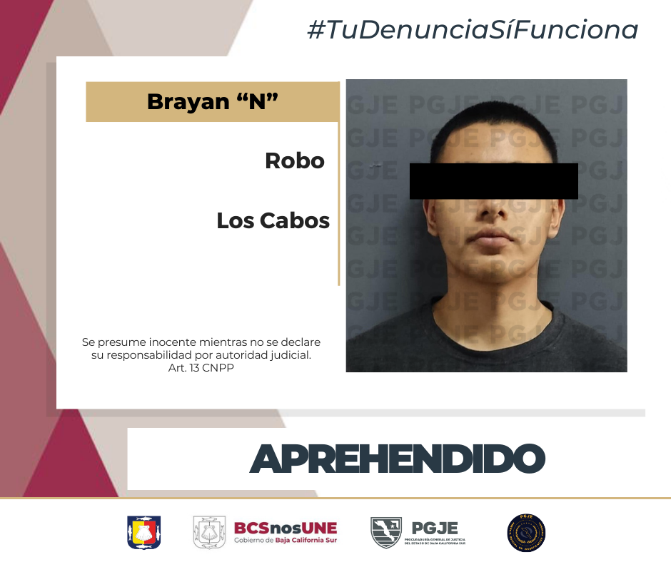 La tarde del martes 20 de febrero en la colonia Ampliación Mariano Matamoros, en Cabo San Lucas, elementos de la Unidad de Investigación de Mandamientos Judiciales, cumplimentaron orden de aprehensión en contra de Brayan “N” de 22 años, relacionado con el delito de robo calificado cometido en lugar cerrado.