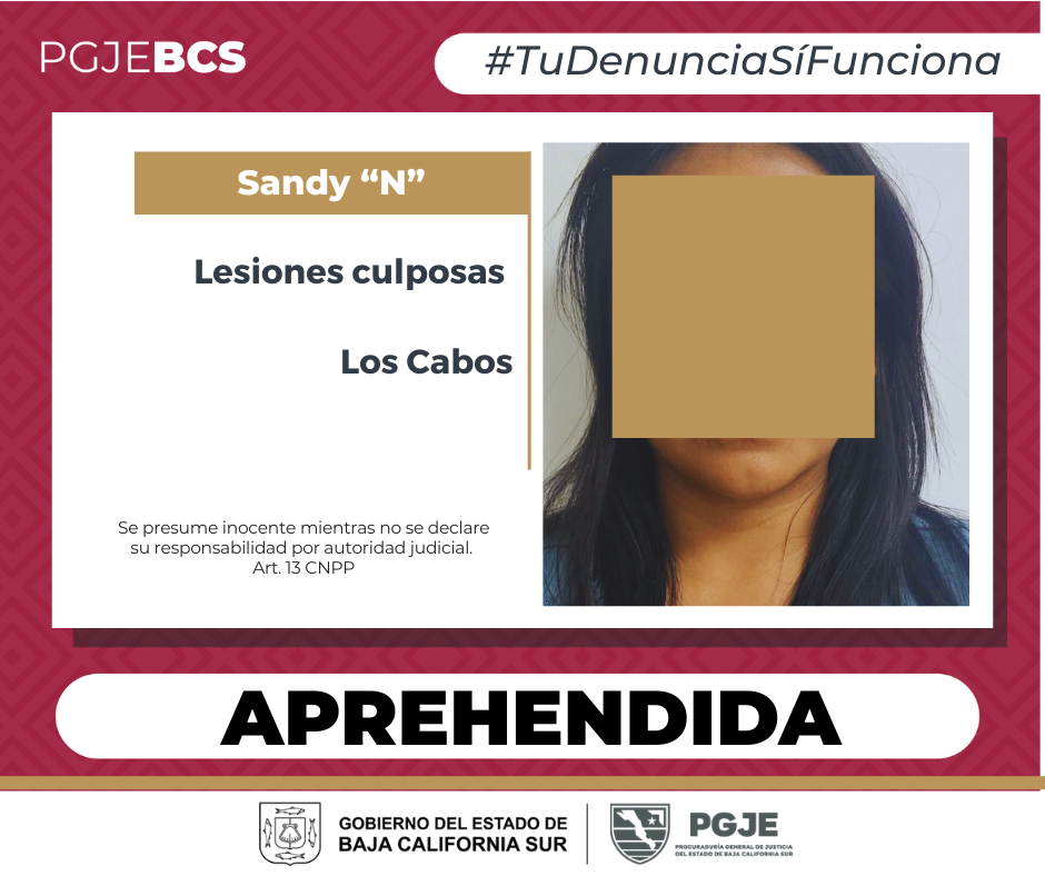 Por su relación en el delito de lesiones culposas, que probablemente cometió en Cabo San Lucas, a Sandy “N”, fue aprehendida la mañana del miércoles 1 de abril por elementos de la Unidad de Mandamientos Judiciales de la Procuraduría General de Justicia del Estado (PGJE) de Baja California Sur.