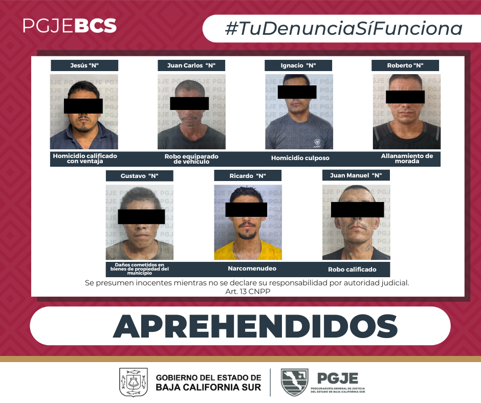En el marco de las acciones de procuración de justicia y combate a la impunidad, agentes de investigación de la Procuraduría General de Justicia del Estado (PGJE) de Baja California Sur, cumplimentaron diversas órdenes de aprehensión en distintos municipios de la entidad, entre los días 25 y 27 de agosto del presente año.