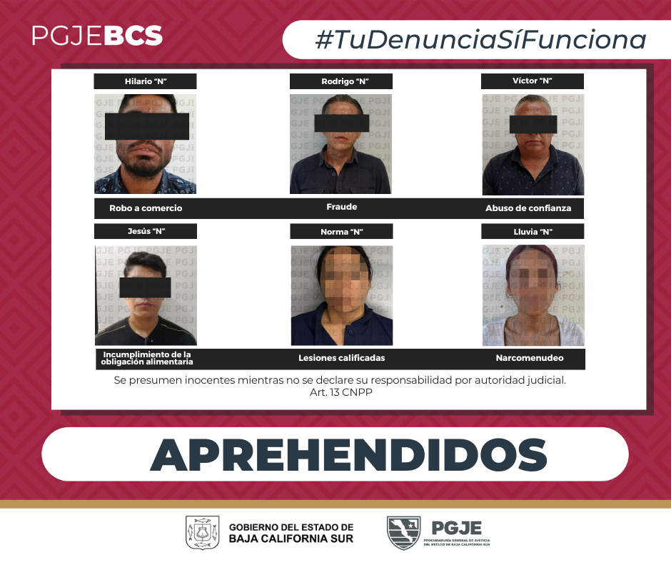 En seguimiento a denuncias ciudadanas y como parte de las acciones para llevar ante la autoridad judicial a probables responsables de delitos, la Procuraduría General de Justicia del Estado (PGJE) de Baja California Sur, del 16 al 19 de marzo, cumplimentó seis órdenes de aprehensión en distintos municipios de la entidad.