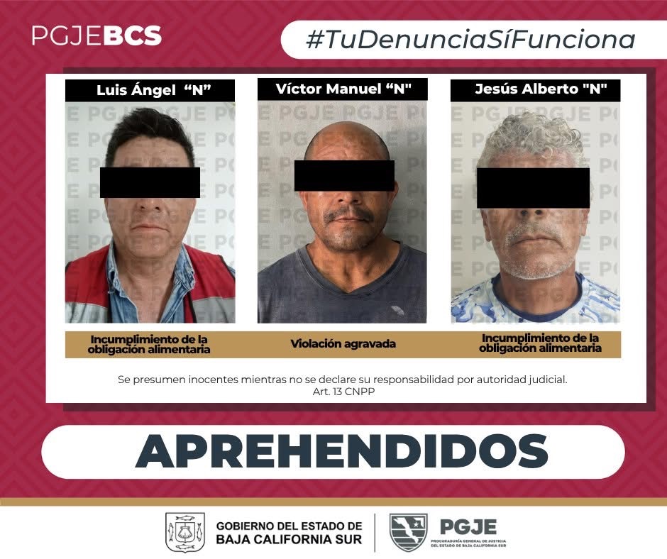 La Procuraduría General de Justicia del Estado (PGJE), a través de agentes de investigación adscritos a la Unidad en Mandamientos Judiciales, cumplimentó tres órdenes de aprehensión por delitos contra la libertad sexual y la familia en los municipios de Los Cabos, Mulegé y La Paz.