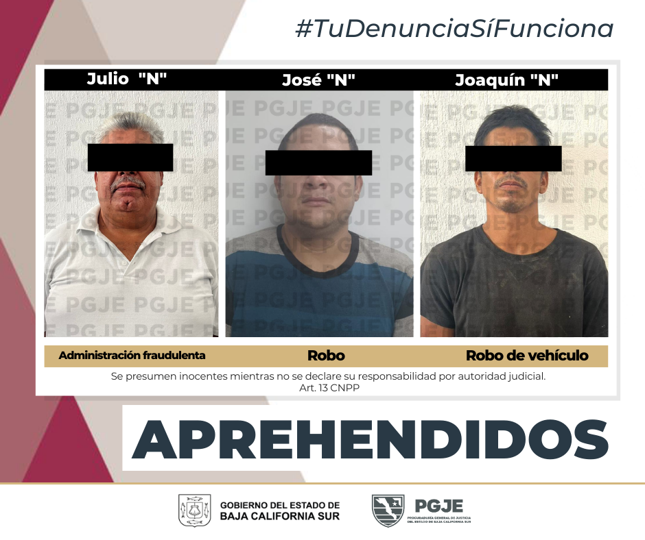 Para dar seguimiento a investigaciones sobre las denuncias que por diversos delitos víctimas y ofendidos presentan ante la Procuraduría General de Justicia del Estado (PGJE) de Baja California Sur, agentes de investigación realizaron operativos, mediante los cuales el martes 3 del mes en curso, aprehendieron a tres personas del sexo masculino en el municipio de Los Cabos