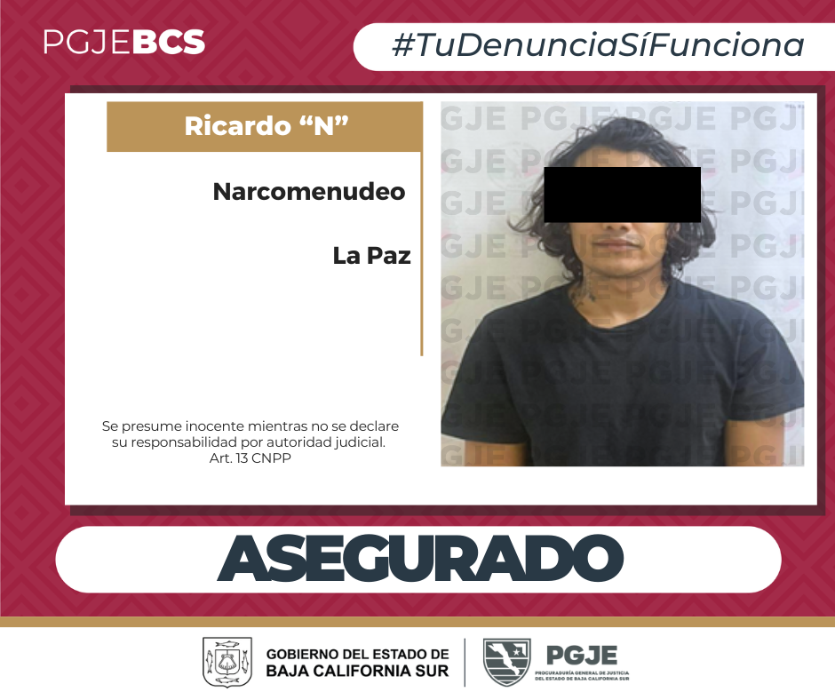 Como resultado de denuncias ciudadanas anónimas y en seguimiento a trabajos de investigación, agentes de la Procuraduría General de Justicia del Estado (PGJE) de Baja California Sur, lograron la detención de una persona del sexo masculino por su probable responsabilidad en delitos contra la salud, en su modalidad de narcomenudeo, en la ciudad de La Paz.