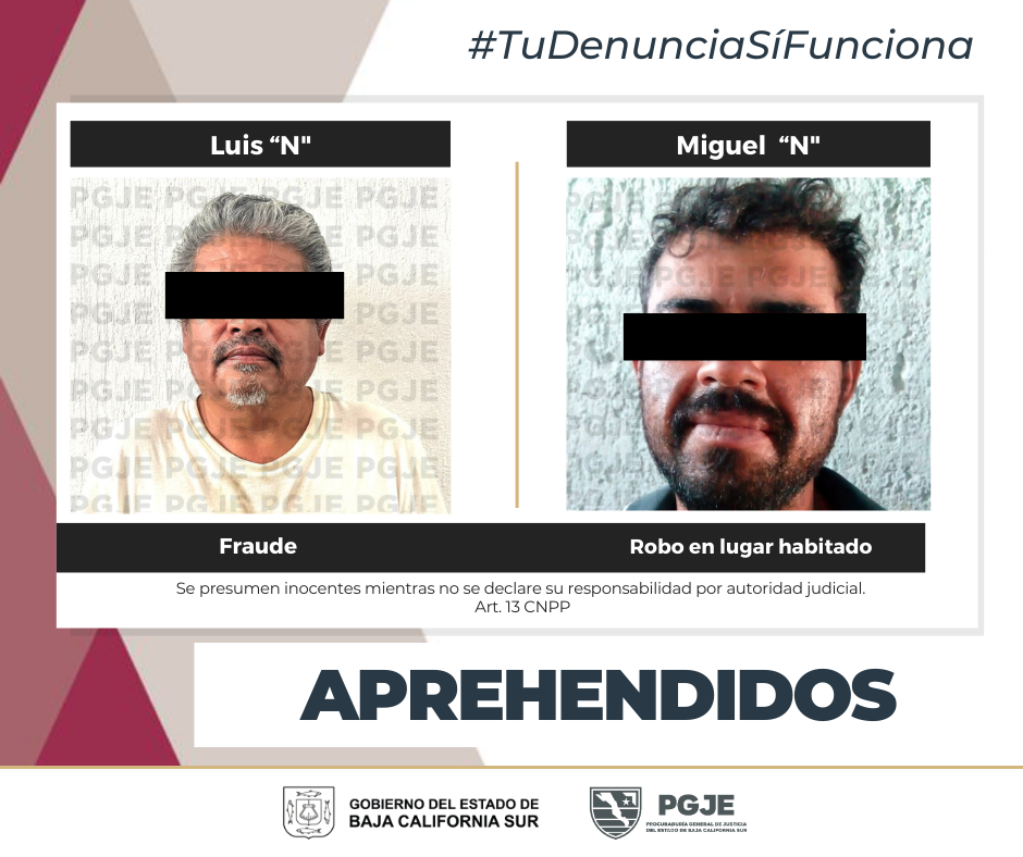 La Procuraduría General de Justicia del Estado (PGJE) de Baja California Sur realizó la detención de dos personas posiblemente relacionadas en diversos delitos en operativos realizados en Loreto y Los Cabos, por agentes de investigación de la Unidad de Mandamientos Judiciales.