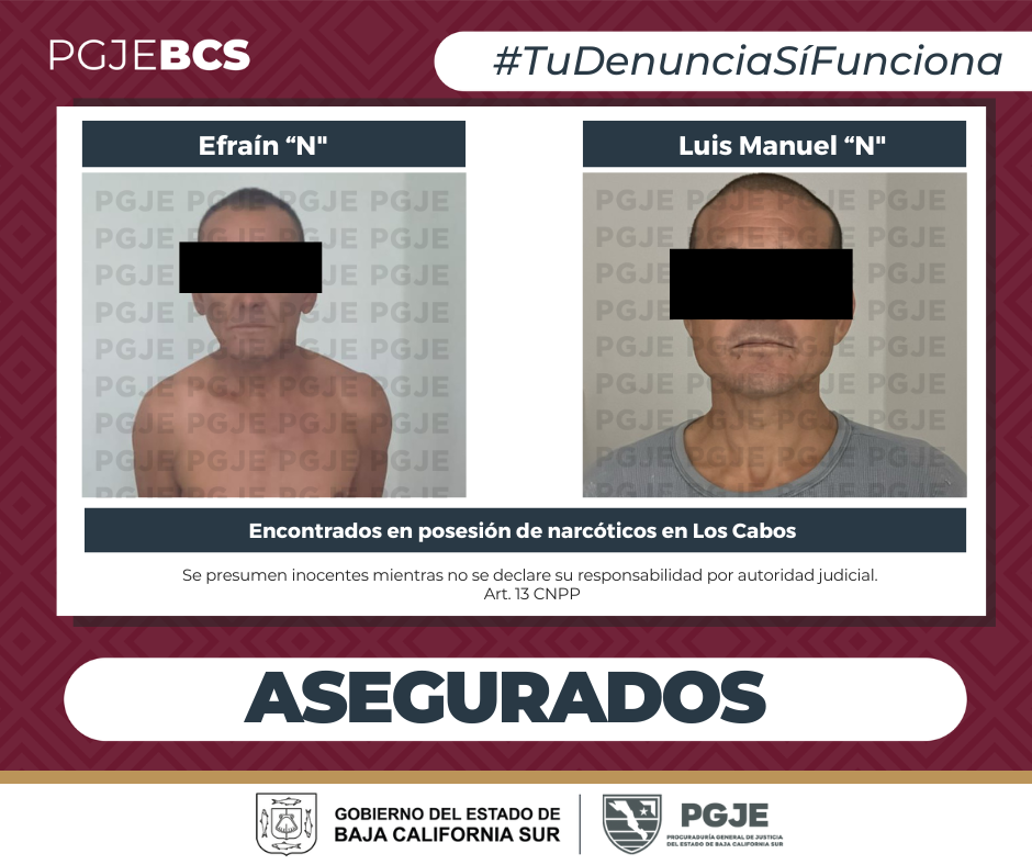 Los detenidos fueron identificados como Luis Manuel “N”, de 42 años, y Efraín “N”, de 49 años, ambos originarios de Baja California Sur.