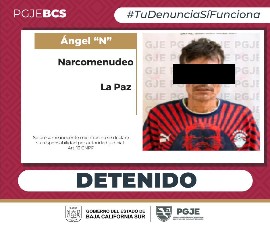 Como resultado de labores de investigación derivadas de denuncias anónimas por la posible venta de narcóticos en colonias con incidencia delictiva, agentes de investigación de la Procuraduría General de Justicia del Estado (PGJE) de Baja California Sur,adscritos a la Subprocuraduría de Atención a Delitos de Alto Impacto (SADAI), lograron la detención de una persona del sexo masculino en la ciudad de La Paz.
