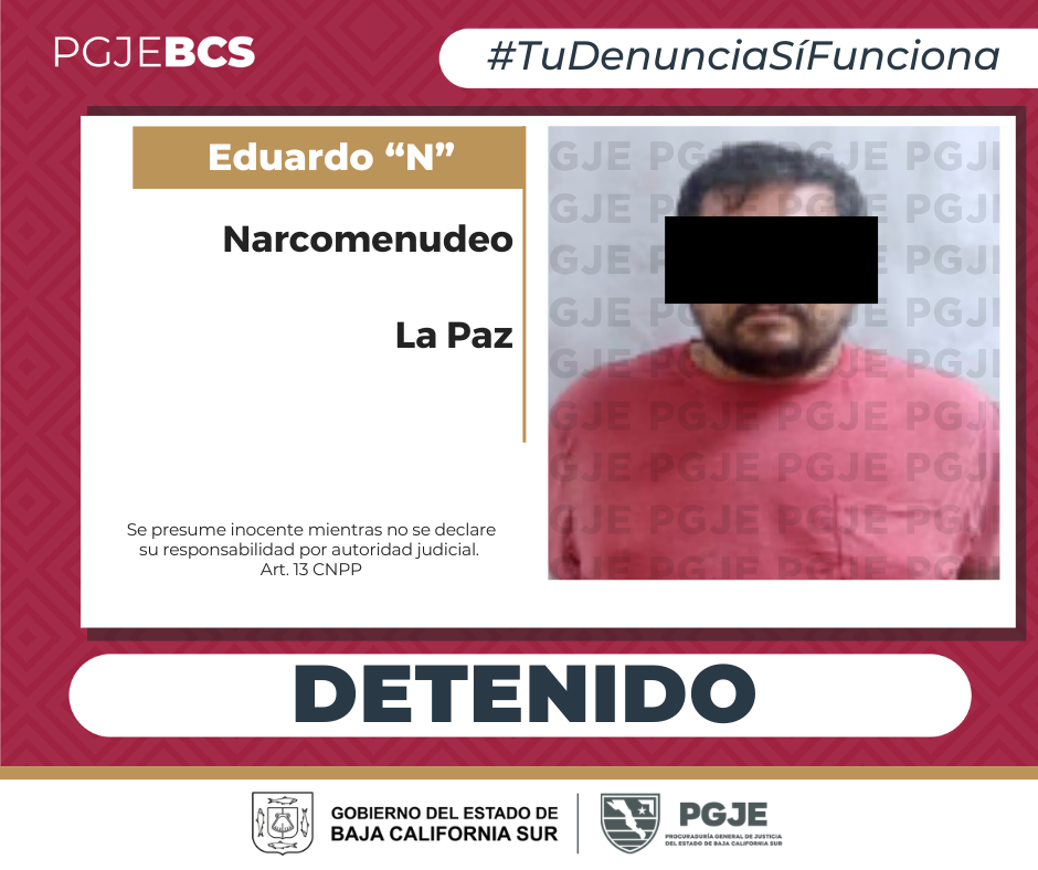 La noche del miércoles 8 de abril, agentes de investigación de la Procuraduría General de Justicia del Estado (PGJE) de Baja California Sur, realizaron la detención de una persona del sexo masculino en la ciudad de La Paz, como parte de labores derivadas de denuncias anónimas por la presunta venta de drogas en colonias con incidencia delictiva.