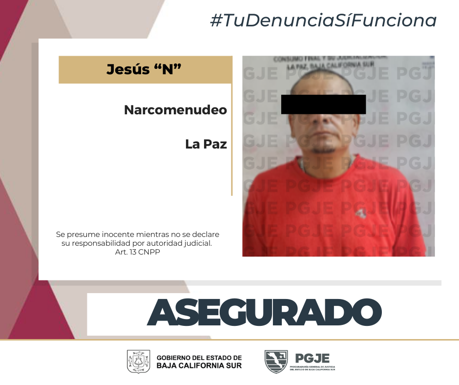 La Procuraduría General de Justicia del Estado (PGJE) de Baja California Sur informa que, como parte de las acciones para combatir el delito de narcomenudeo, agentes de investigación detuvieron a un hombre en posesión de sustancias ilícitas la tarde del jueves 14 de noviembre en la ciudad de La Paz.