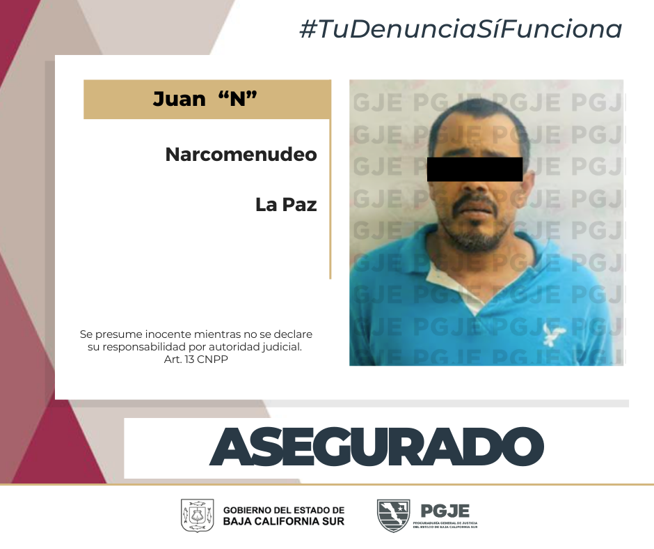 Un hombre identificado como Juan “N”, de 48 años y originario de Sinaloa, fue detenido el pasado 18 de septiembre en la colonia Antonio Navarro Rubio, en La Paz, por su probable participación en delitos contra la salud, por elementos de la Procuraduría General de Justicia del Estado (PGJE) de Baja California Sur.