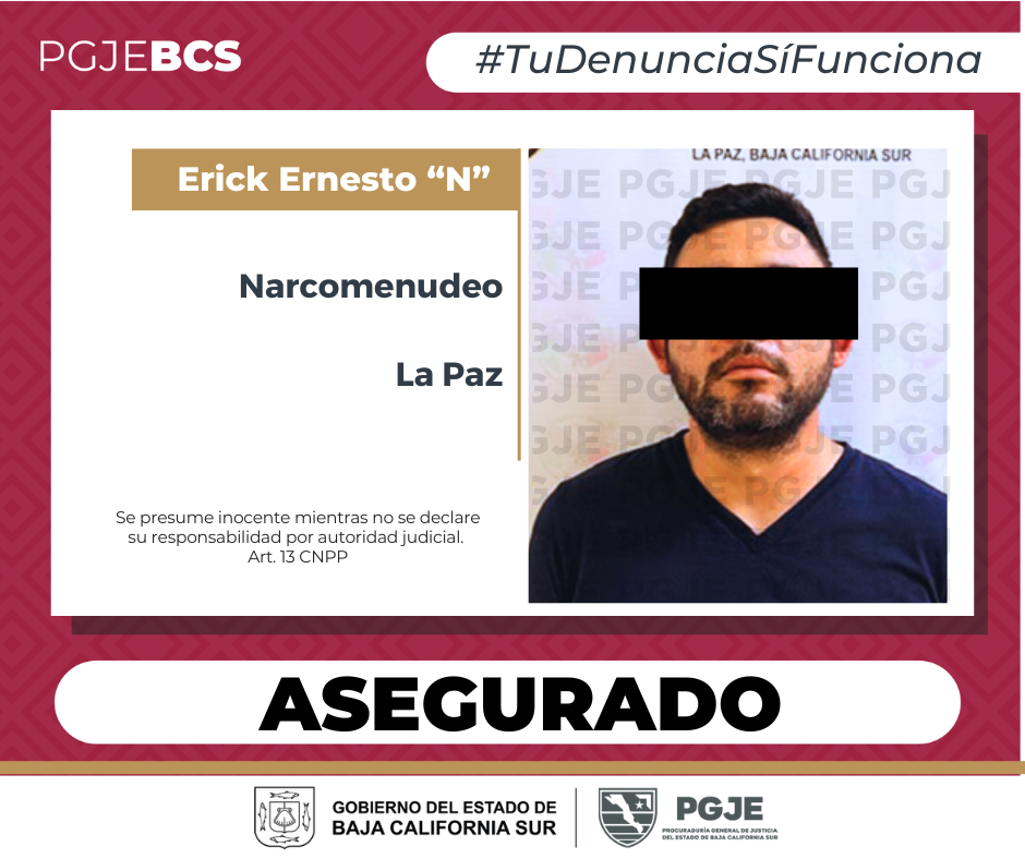 La Procuraduría General de Justicia del Estado (PGJE) de Baja California Sur logró la detención de una persona del sexo masculino por su probable responsabilidad en delitos contra la salud, como resultado de labores de investigación derivadas de denuncias anónimas relacionadas con la venta de drogas en diversas colonias con índice delictivo.