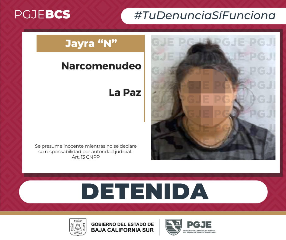 Derivado de labores de investigación en atención a denuncias anónimas por la posible venta de drogas, laProcuraduría General de Justicia del Estado (PGJE)de Baja California Sur, a través de la Subprocuraduría de Atención a Delitos de Alto Impacto (SADAI) logró la detención de una persona del sexo femenino en la ciudad de La Paz.