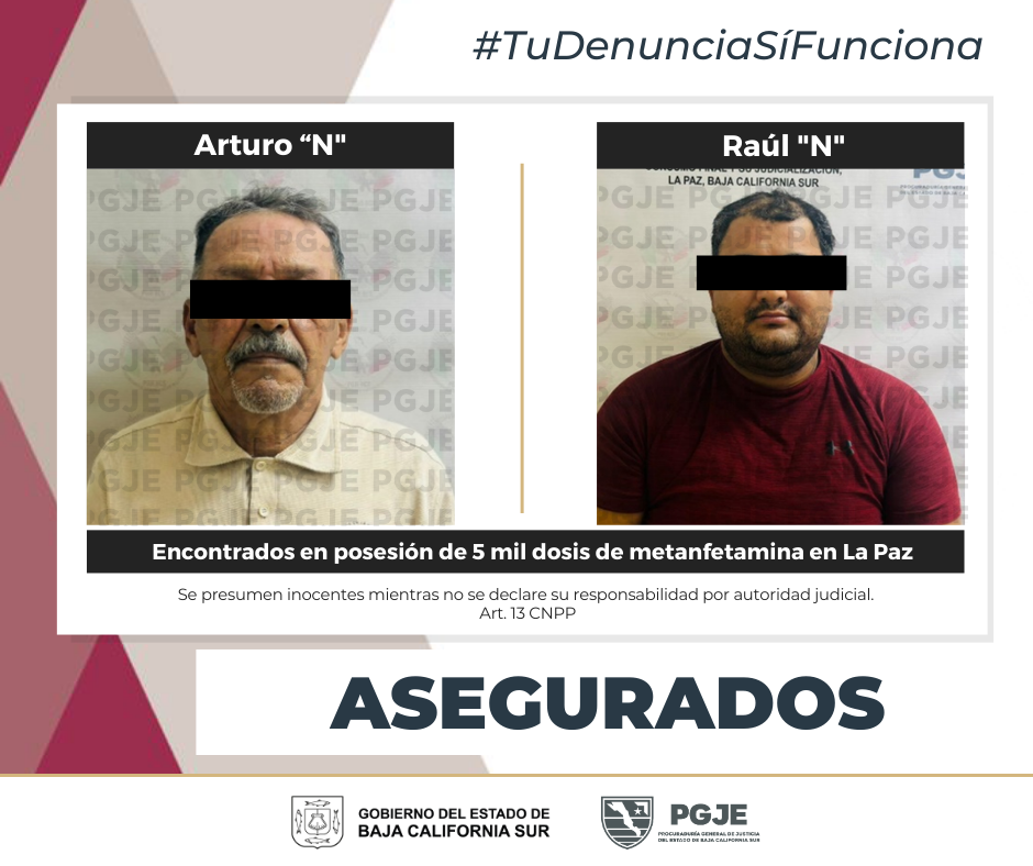 Agentes de investigación de la Procuraduría General de Justicia del Estado (PGJE) de Baja California Sur, detuvieron a dos hombres en posesión de 5 mil dosis de metanfetamina la tarde del miércoles 4 de septiembre en la capital del estado.