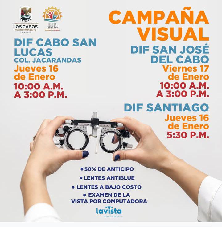 En Cabo Lucas, la cita es este próximo 16 de enero de 10:00 de la mañana a 3:00 de la tarde en el edificio central de DIF, ubicado en la colonia Jacarandas. Ese mismo día, la campaña se traslada a la delegación de Santiago, donde se atenderá a la ciudadanía a partir de las 5:30 de la tarde.