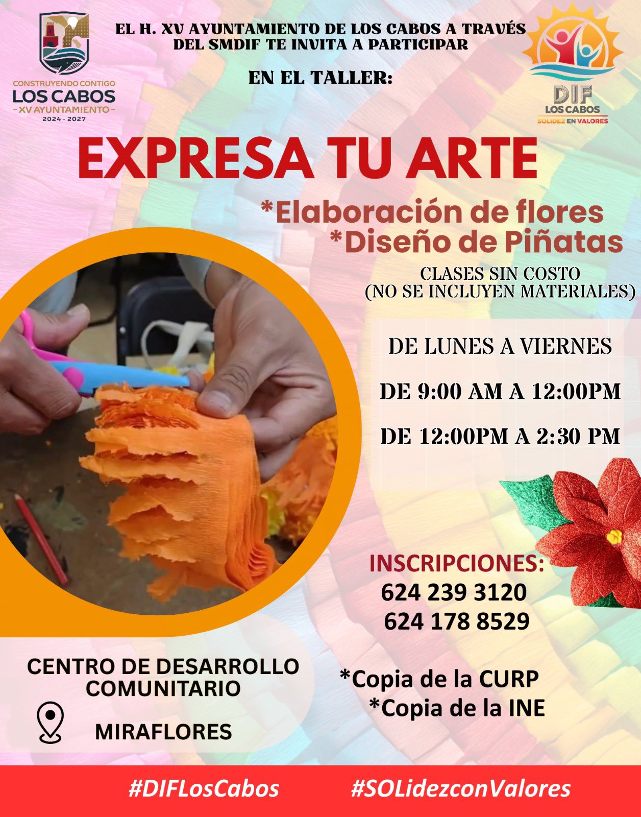 Los Cabos, Baja California Sur.- El H. XV Ayuntamiento de Los Cabos, a través del Sistema DIF, invita a la comunidad a participar en una serie de talleres gratuitos que se impartirán en distintos Centros de Desarrollo Comunitario del municipio. Entre las actividades destacan cursos de manualidades, elaboración de piñatas, flores, así como pedicura y manicura, los cuales están diseñados para fomentar habilidades prácticas y ofrecer espacios de convivencia y aprendizaje.