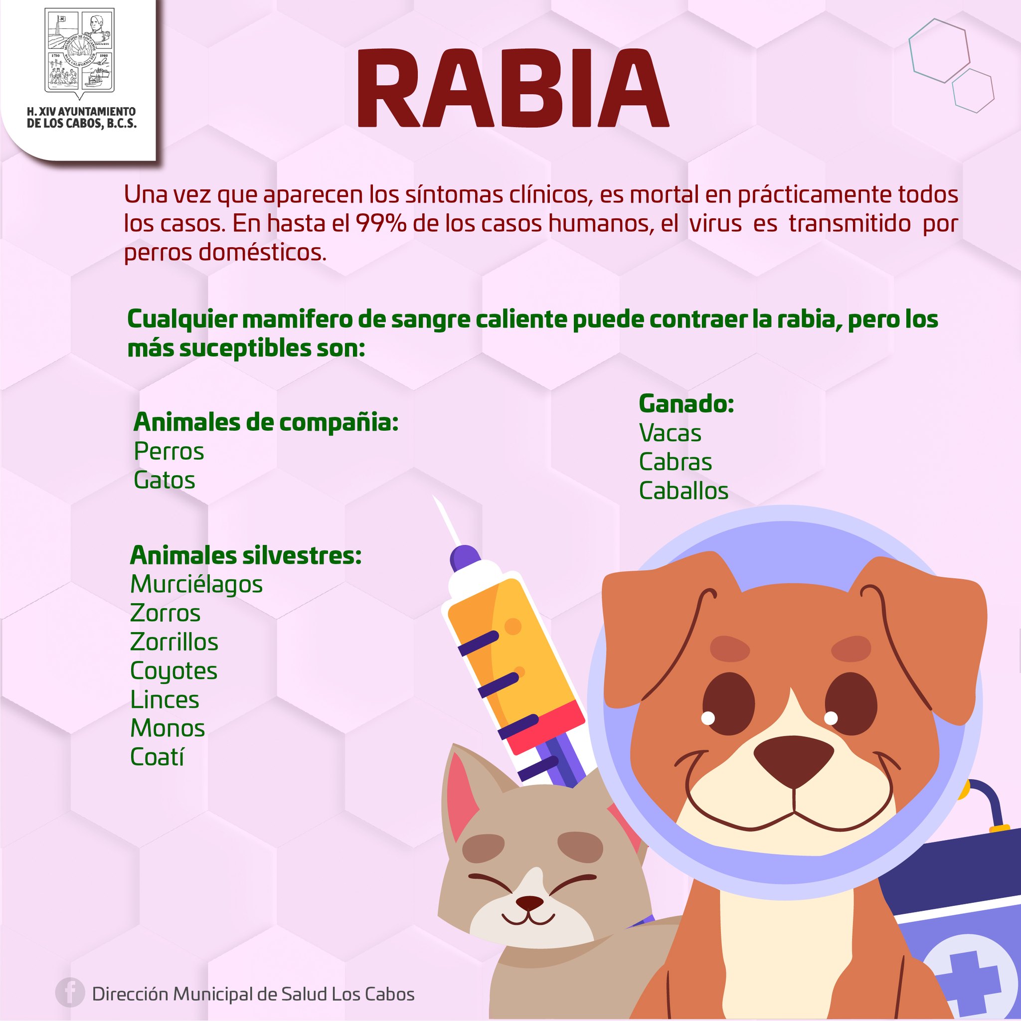 Los Cabos, B.C.S., 30 abril 2024.- La Dirección Municipal de Salud hace hincapié en la importancia de estar alerta y tomar medidas preventivas ante la enfermedad conocida como rabia, especialmente en relación con la mordedura de animales en el municipio de Los Cabos.