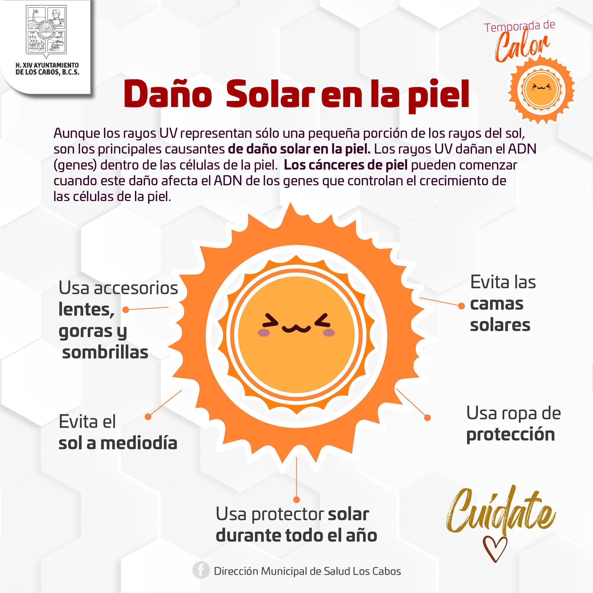 Los Cabos, B.C.S., 04 junio 2024.- Ante el incremento de la radiación solar durante esta temporada, es crucial tomar medidas preventivas para evitar quemaduras en la piel, por ello, personal de la Dirección Municipal de Salud exhorta a la ciudadanía a atender las recomendaciones y evitar afectaciones a la salud.