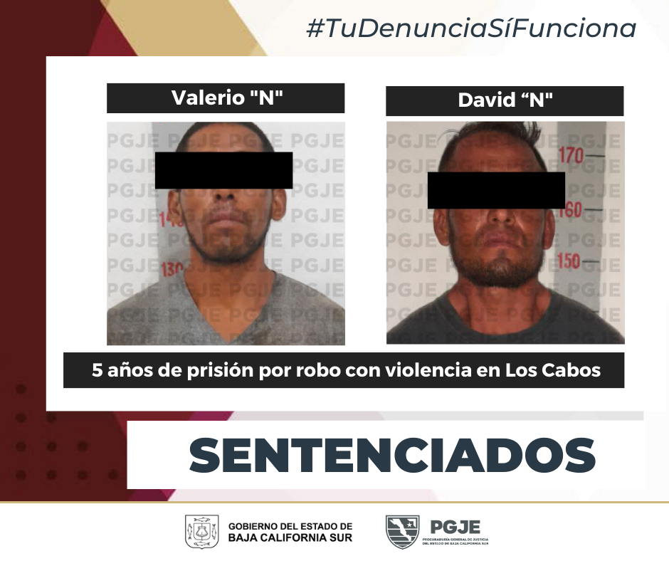 La Procuraduría General de Justicia del Estado (PGJE), de Baja California Sur, obtuvo 2 sentencias condenatorias en contra de dos personas del sexo masculino por el delito de robo cometido por dos personas empleando violencia, a quienes se le impuso una pena privativa de su libertad de 5 años 4 meses y un día de multa.