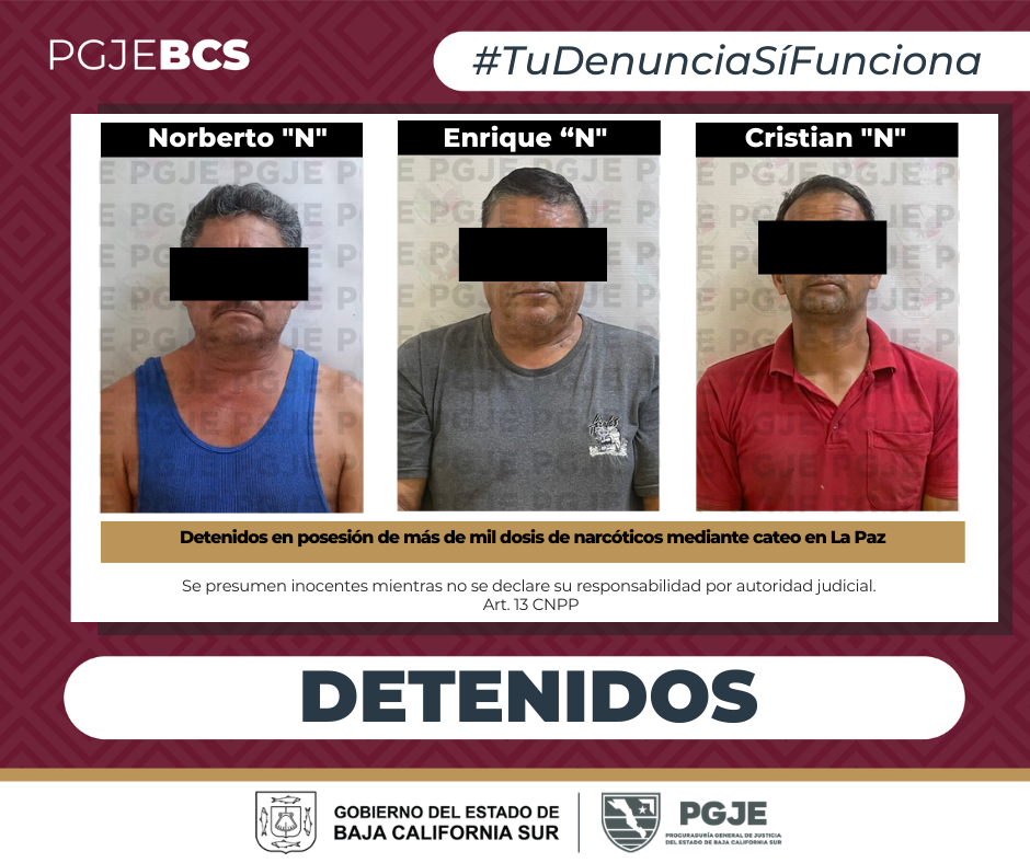 Mediante orden de cateo ejecutada en un domicilio de la colonia Indeco, en la ciudad de La Paz, la Procuraduría General de Justicia del Estado (PGJE) logró el aseguramiento de más de mil dosis de droga listas para su distribución, así como la detención de tres personas del sexo masculino.