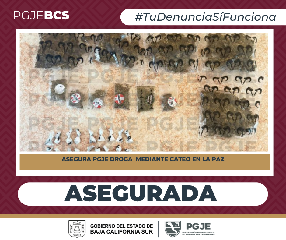 Mediante orden de cateo ejecutada en un domicilio de la colonia Santa Fe, en la ciudad de La Paz, la Procuraduría General de Justicia del Estado (PGJE), en coordinación con la Secretaría de Marina (SEMAR)y la Secretaría de Seguridad Pública en la seguridad perimetral, logró el aseguramiento de 400 dosis de droga listas para su venta en las calles de la capital.