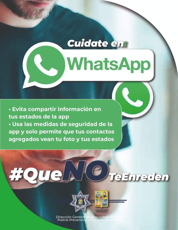 Los Cabos B.C.S., a 27 de septiembre del 2024.- Debido al aumento considerable de intentos y robo de cuentas en la red social denominada WhatsApp, el Gobierno de Los Cabos a través de la Dirección General de Seguridad Pública, Policía Preventiva y Tránsito Municipal, que encabeza el capitán Christopher Jordi López Monge, recomienda a la población prevenir este tipo de incidentes extremando la precaución al dar cualquier tipo de dato, contraseña o PIN.