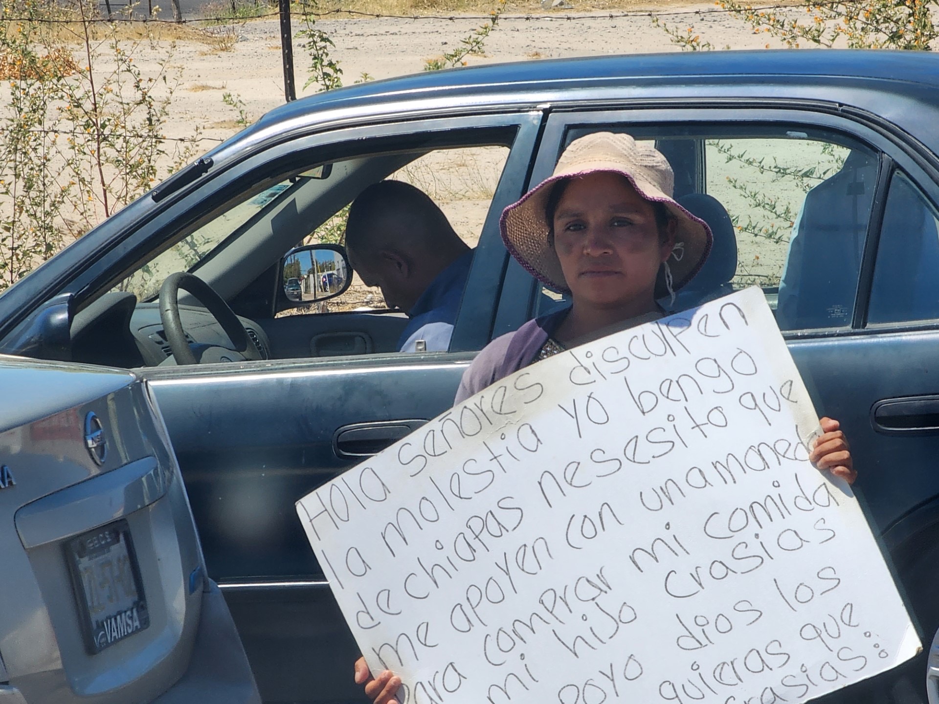 Señala que proviene del estado de Chiapas y necesita de la ayuda de la ciudadanía, consistente en entregarles una moneda para el sostenimiento de su hijo, que le permita comprarle comida, ya que no cuenta con ninguna forma de ingresos económicos y para ello permanece en la vía pública, soportando las inclemencias climáticas entre el tráfico vehicular.