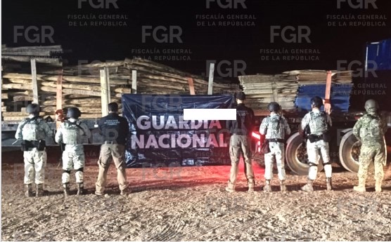 En el cateo llevado a cabo en el lugar, con el apoyo de elementos de la Policía Federal Ministerial, de servicios periciales, de la Secretaría de la Defensa Nacional (Defensa) y de la Guardia Nacional (GN) se aseguraron 571 piezas de madera de rollo y 155 tablones de madera de diverso grosor.