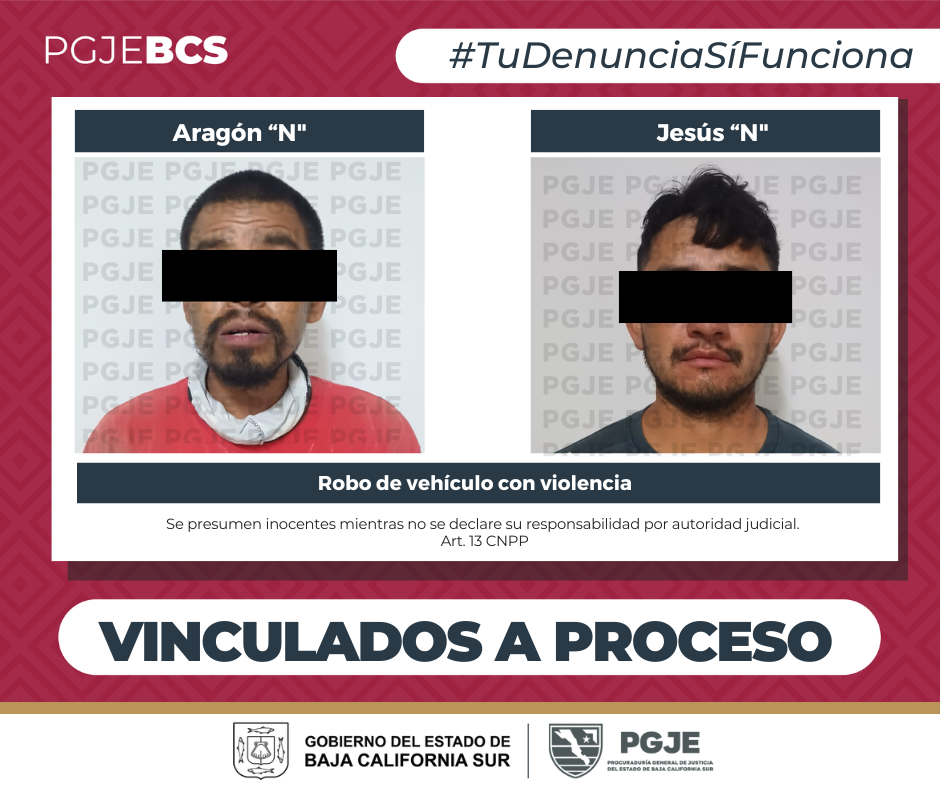 A tres días del hecho con apariencia de delito, Aragón N y Jesús N quedaron en prisión preventiva justificada, luego de los datos de prueba presentados por el agente del Ministerio Púbico de la Unidad Especializada en Atención a Personas Detenidas en La Paz, por su relación en el delito de robo de vehículo.