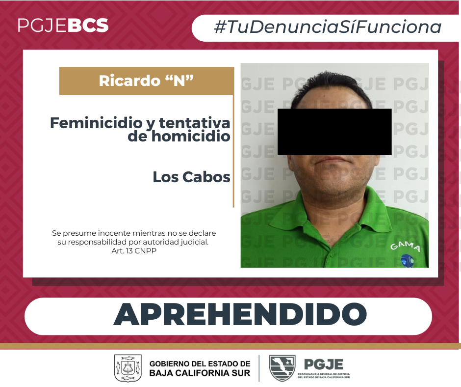 Agentes de investigación de la Procuraduría General de Justicia del Estado (PGJE) de Baja California Sur, cumplimentaron orden de aprehensión en contra de Ricardo “N”, de 34 años de edad, quien era requerido por autoridades del estado de Jalisco por los delitos de feminicidio y tentativa de homicidio calificado.