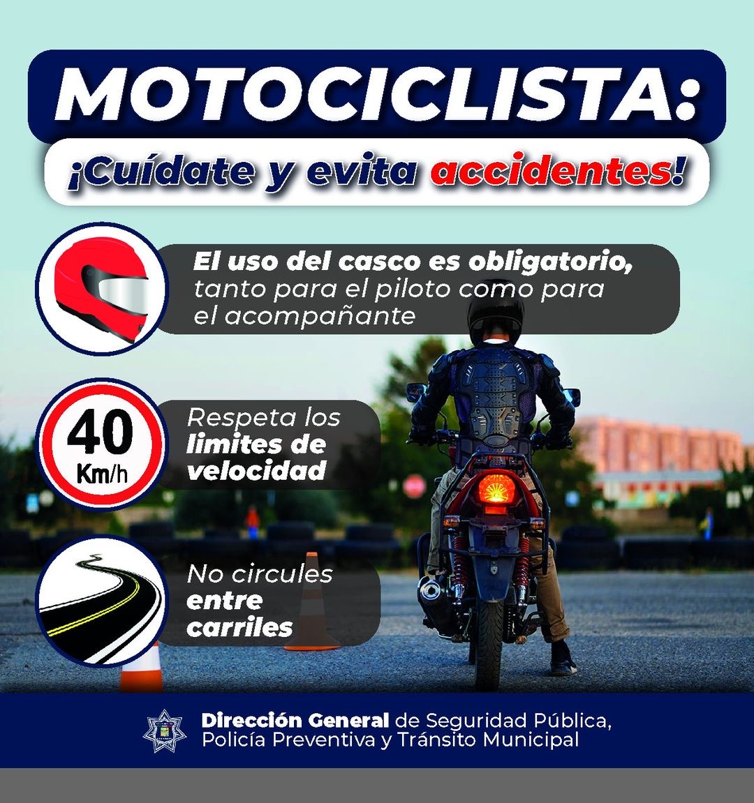 Los Cabos, B.C.S., 25 septiembre 2024.- La Dirección General de Seguridad Pública, Policía Preventiva y Tránsito Municipal, encabezada por el capitán de fragata Christopher López Monge, recuerda a la población la importancia de seguir ciertas recomendaciones al momento de conducir una motocicleta.