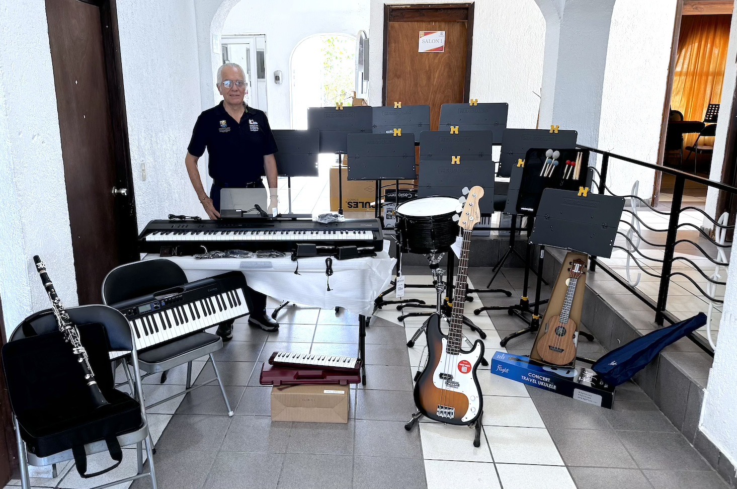 Entre los instrumentos entregados se encuentran piano digital, teclado eléctrico, clarinete, bajo eléctrico, ukelele, tarola, atriles, melódica profesional, pedales para piano eléctrico, platillo suspendido, mazos y baquetas, entre otros accesorios.