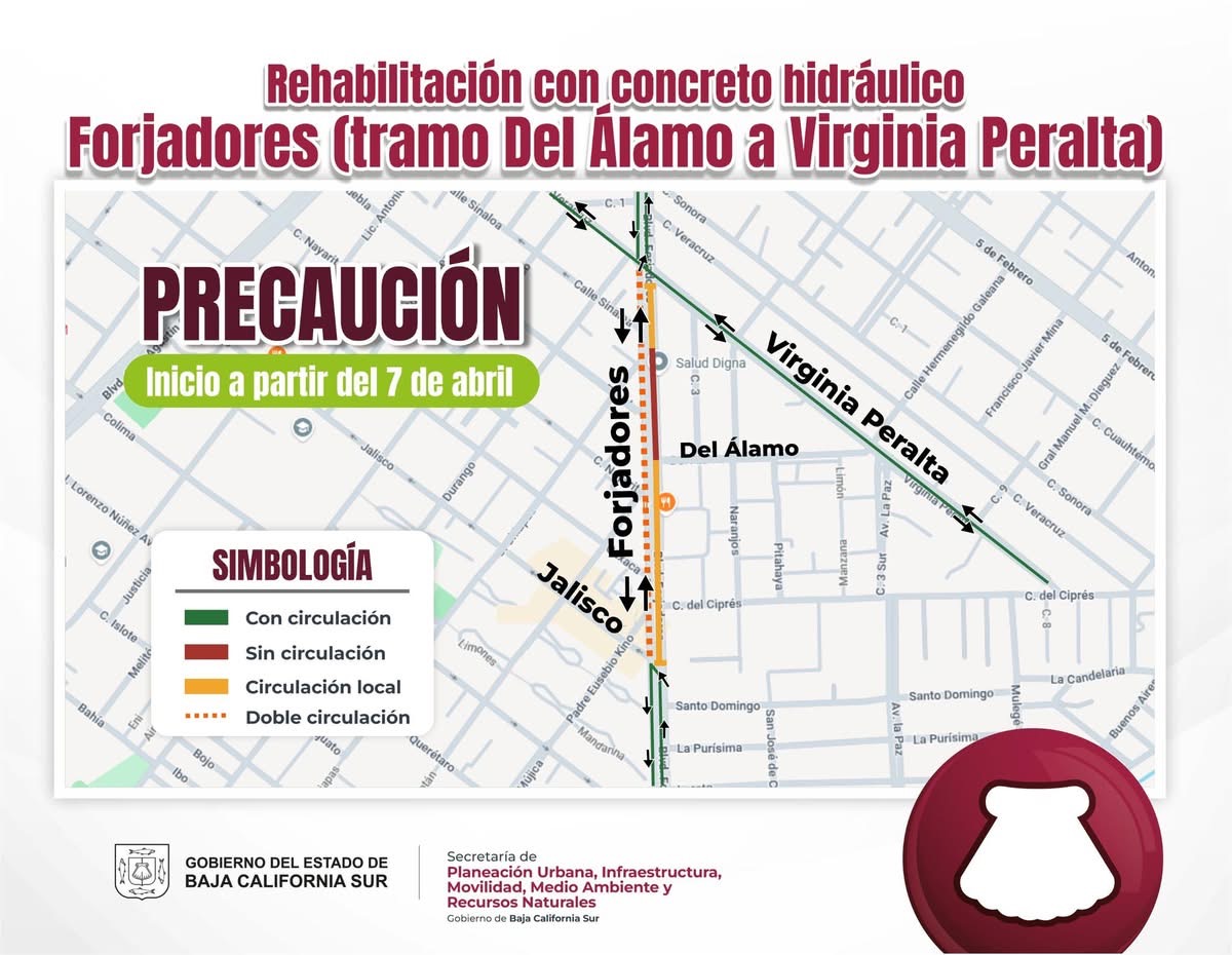 Con el objetivo de mejorar la seguridad y eficiencia en los traslados de automovilistas, el Gobierno del Estado iniciará este martes 7 de abril la reconstrucción de un tramo de la calzada Forjadores de Sudcalifornia a través de la Secretaría de Planeación Urbana, Infraestructura, Movilidad, Medio Ambiente y Recursos Naturales (Sepuimm).