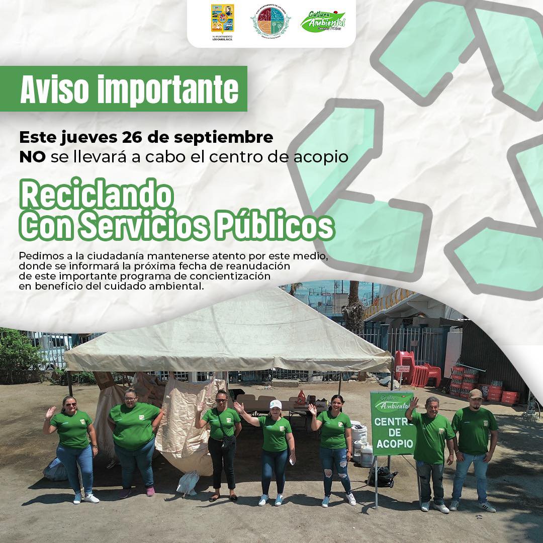 Los Cabos, B,C,S,. 25 septiembre del 2024.- La Dirección General de Servicios Públicos, a través de la Coordinación de Cultura Ambiental, informa a la ciudadanía que el programa de acopio “Reciclando Con Servicios Públicos” no se llevará a cabo este jueves, se le invita a la población a mantenerse atenta a este medio, donde se informará la próxima fecha de reanudación.