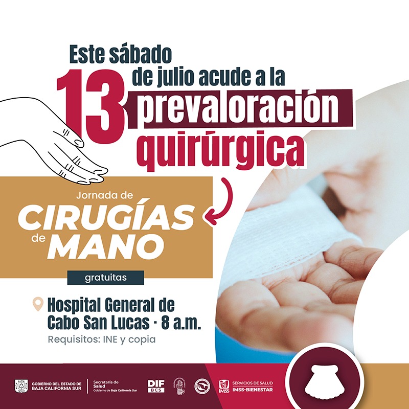 El Gobierno del Estado, a través de la Secretaría de Salud, desarrollará este sábado jornada pre quirúrgica de manos en el Hospital General de Cabo San Lucas, como resultado de los esfuerzos que suma con una agrupación nacional de médicos especialistas, con el objetivo de mejorar las condiciones de bienestar de sudcalifornianas y sudcalifornianos con ese tipo de problema.