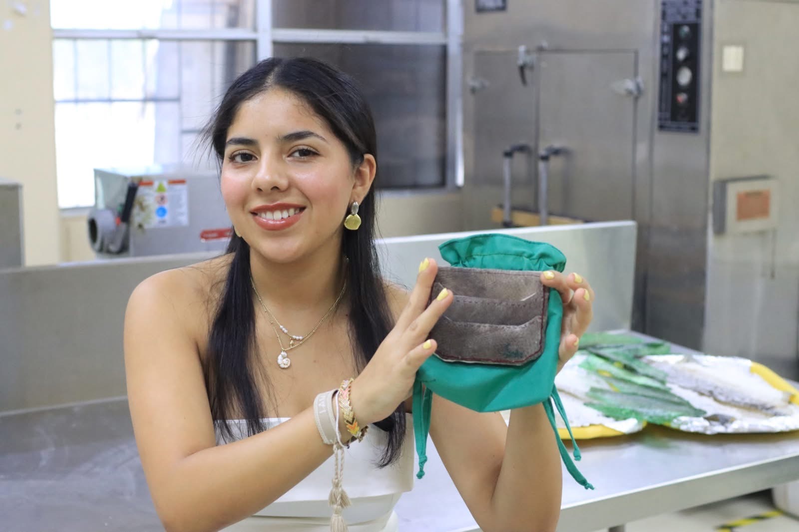 Karla Rodríguez Muñoz estudiante de la Licenciatura en Bioingeniería en Acuicultura de la Universidad Autónoma de Baja California Sur (Uabcs), desarrolla un innovador proyecto de investigación enfocado en el aprovechamiento de pieles de pescado como materia prima para la elaboración de productos artesanales, tales como carteras, bolsos y cinturones.