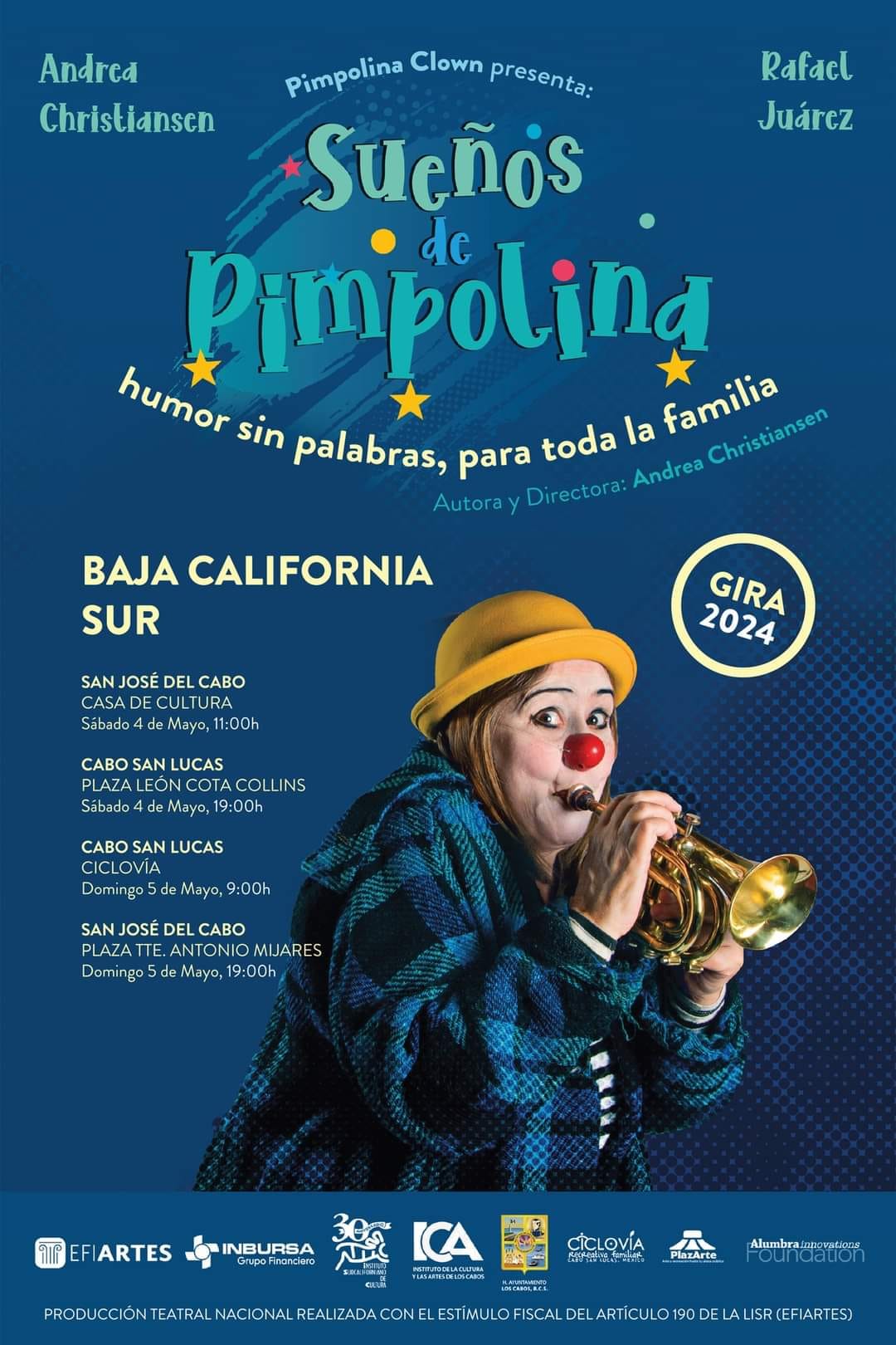 Los Cabos, B.C.S., 03 mayo 2024.- Durante los próximos días, la ciudadanía de Cabo San Lucas contará con diversas presentaciones artísticas-culturales para disfrutar en familia, mismas que fueron programadas a través del Instituto de Cultura y las Artes del Municipio de Los Cabos (ICA); la primera de ellas es “Sueños de Pimpolina: Humor sin palabras”, que se trata de una propuesta escénica de pantomima, técnica clown y comedia, de la autoría de Andrea Christiansen, con la participación de Rafael Juárez.