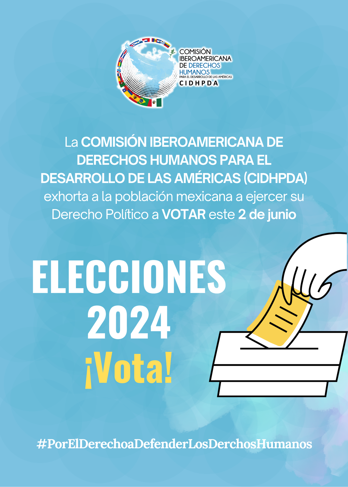 La COMISIÓN IBEROAMERICANA DE DERECHOS HUMANOS PARA EL DESARROLLO DE LAS AMÉRICAS (CIDHPDA) exhorta a la población mexicana a ejercer su Derecho Político a VOTAR este 2 de junio.