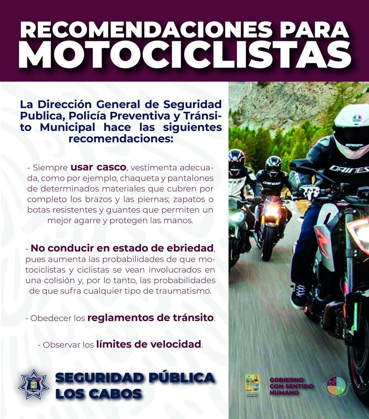 Los Cabos, B.C.S., 17 abril 2024.- La Dirección General de Seguridad Pública, Policía Preventiva y Tránsito Municipal, hace un llamado a personas motociclistas de la comunidad a acatar las medidas de seguridad para prevenir accidentes, en particular, se enfatiza la importancia de utilizar el casco de protección durante la conducción, con el objetivo de salvaguardar la integridad física de las y los conductores, así como reducir los riesgos de lesiones graves en caso de un incidente.