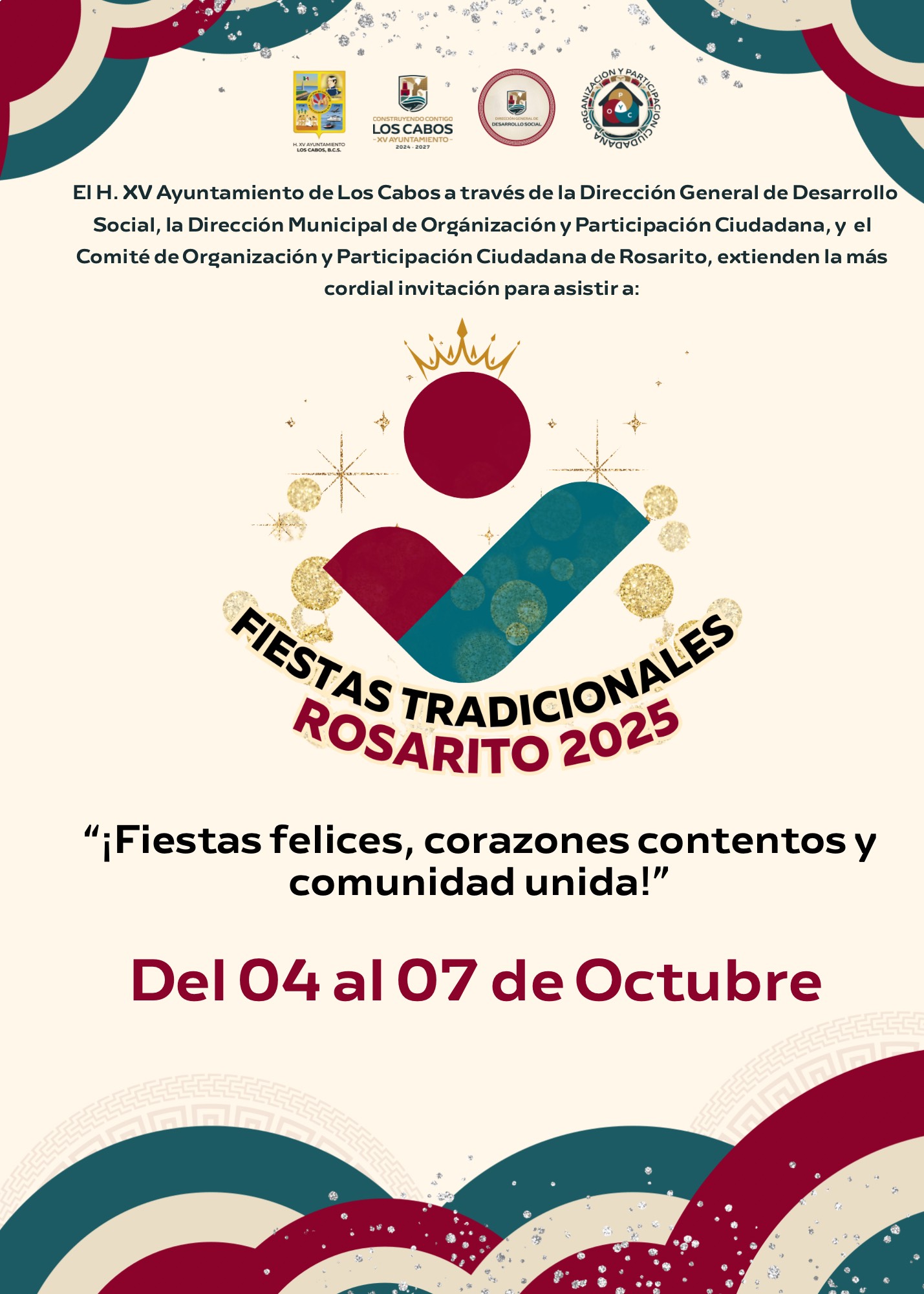 Los Cabos, Baja California Sur.- Del 04 al 07 de octubre se llevarán a cabo las Fiestas Tradicionales Rosarito 2025, con un programa que integra actividades deportivas, culturales y artísticas para todas las edades, consolidándose como uno de los eventos de mayor arraigo en la comunidad.