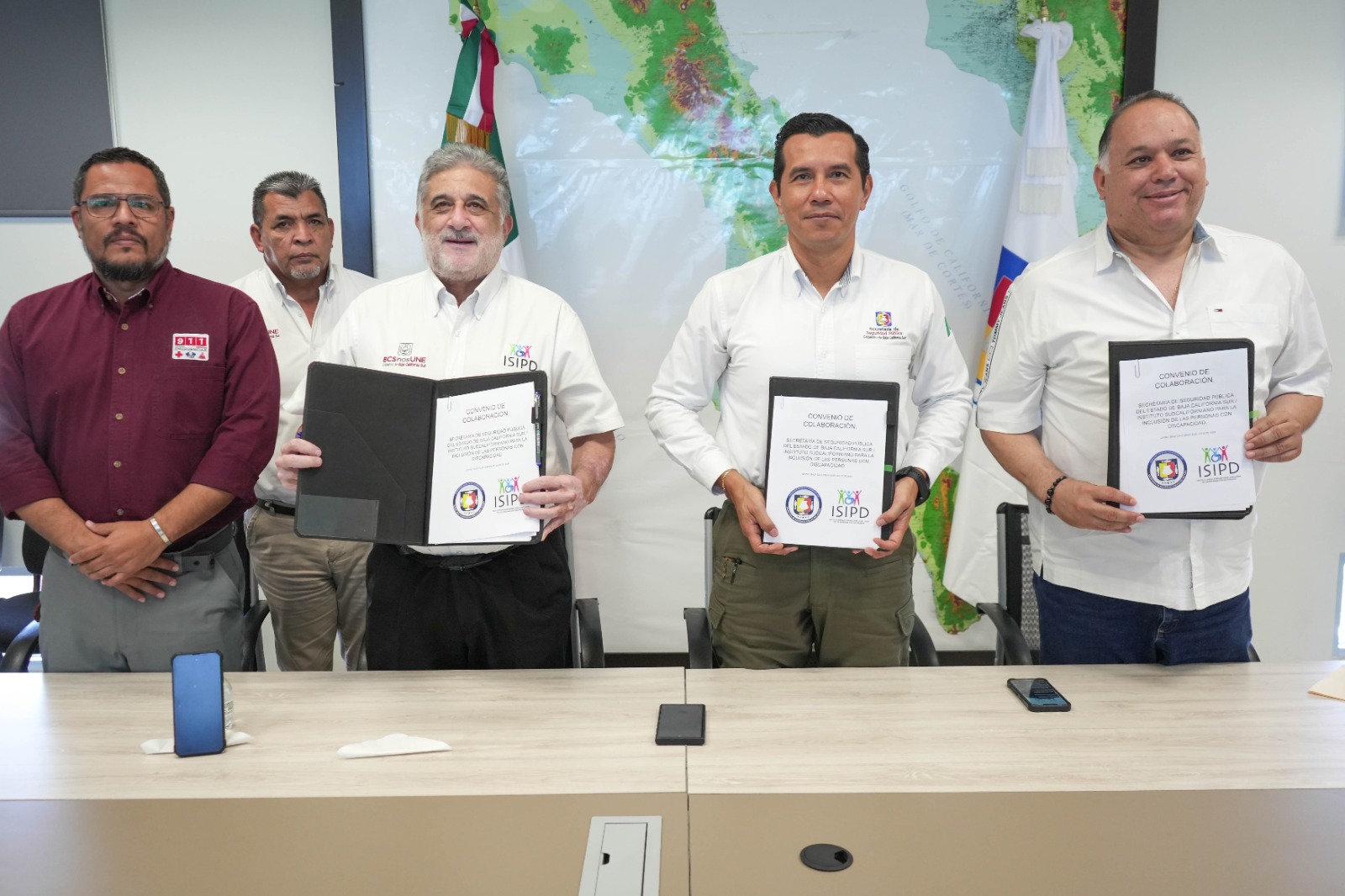 El convenio fue signado por los titulares de SSPE, Luis Alfredo Cancino Vicente, Jorge Alberto Vale Sánchez, titular de ISIPD, secretario del Trabajo, Bienestar y Desarrollo Social, Omar Antonio Zavala Agúndez, como testigo, así como el director de los centros C4 en la entidad.